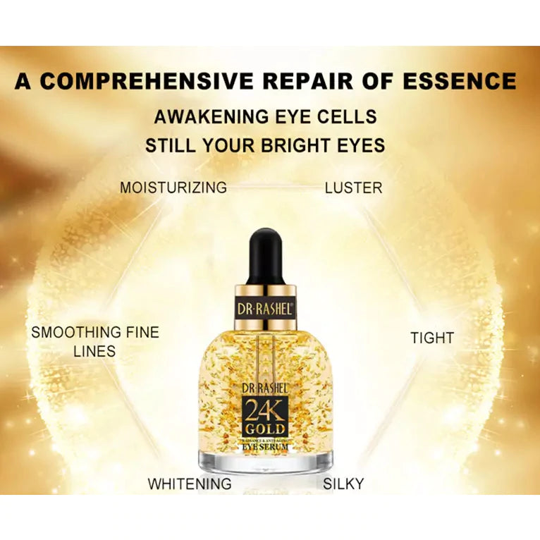 DR•RASHEL 24K gold eye serum deeply nourishes the delicate skin around the eyes, reduces wrinkles on the eyes, and brightens the eyes. Contains pure 24K GOLD AND collagen, known for its affinity with skin and its ability to improve the appearance of aging skin. With hyaluronic acid, it strengthens, soothes and brightens the eye, helping to eliminate dark circles.